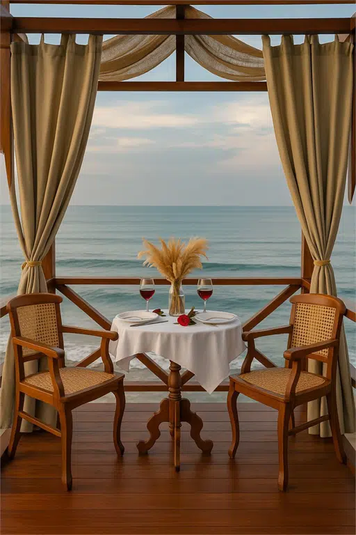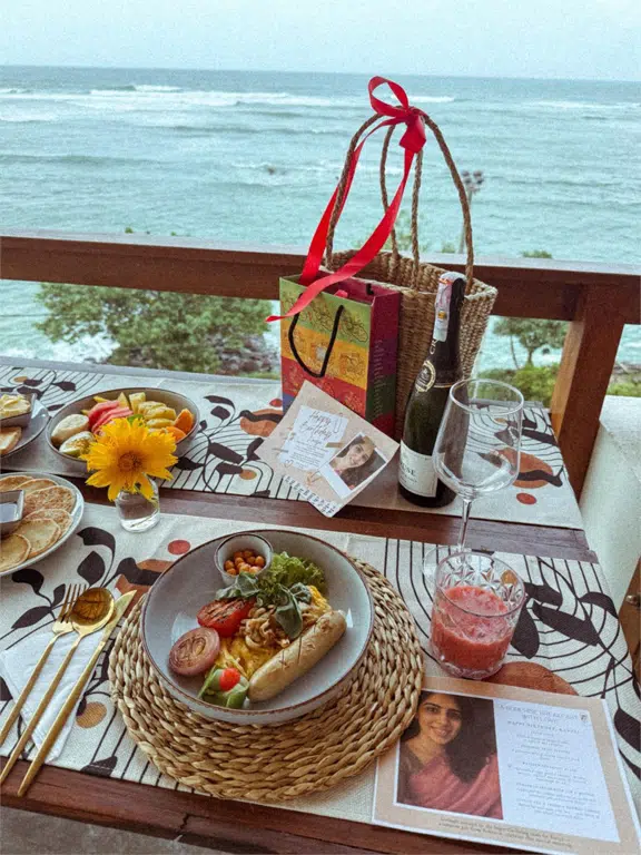 Experience a romantic private dinner at Ocean Bliss by Sugar Co-living, a boutique beachfront hotel in Weligama. Guests staying in suite rooms can request a candlelit dinner setup on their private balcony or open-air lounge with panoramic ocean views. Perfect for honeymoons, anniversaries, or proposals. Choose from a curated Sri Lankan rice & curry menu or a Western-style dinner, freshly prepared by our in-house chef. Setup includes elegant table decor, soft lighting, and a peaceful coastal atmosphere.