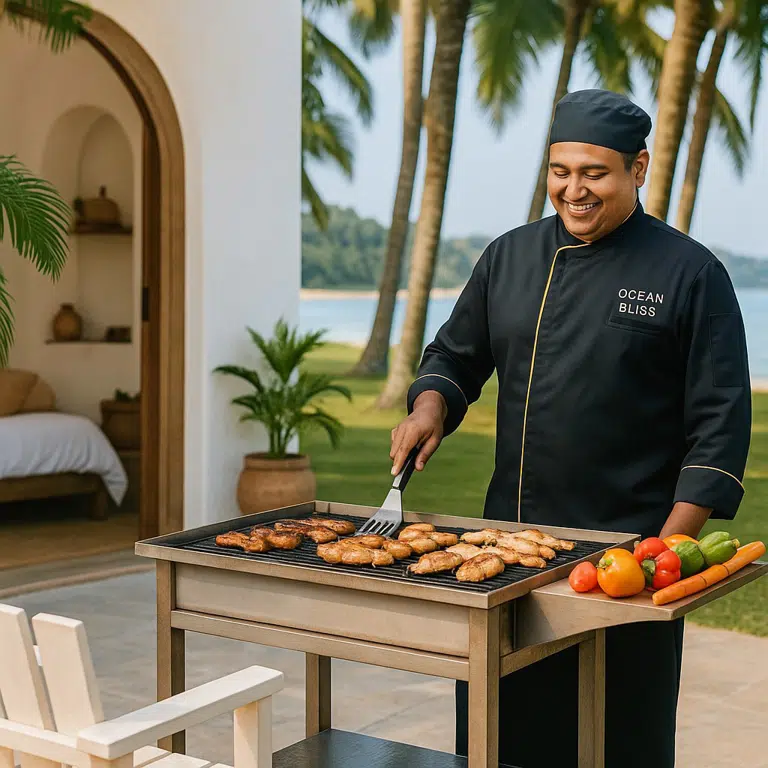 Turn your evening into a memorable beachside BBQ at Ocean Bliss by Sugar Co-living, a boutique beachfront hotel in Weligama. Whether you’re a couple or a small group, our in-house chef will prepare a delicious grill session just for you. Choose from seafood, chicken, or vegetarian options. Enjoy the BBQ setup in our garden, cliff deck, or your private balcony with ocean breeze, sunset views, and laid-back ambiance.